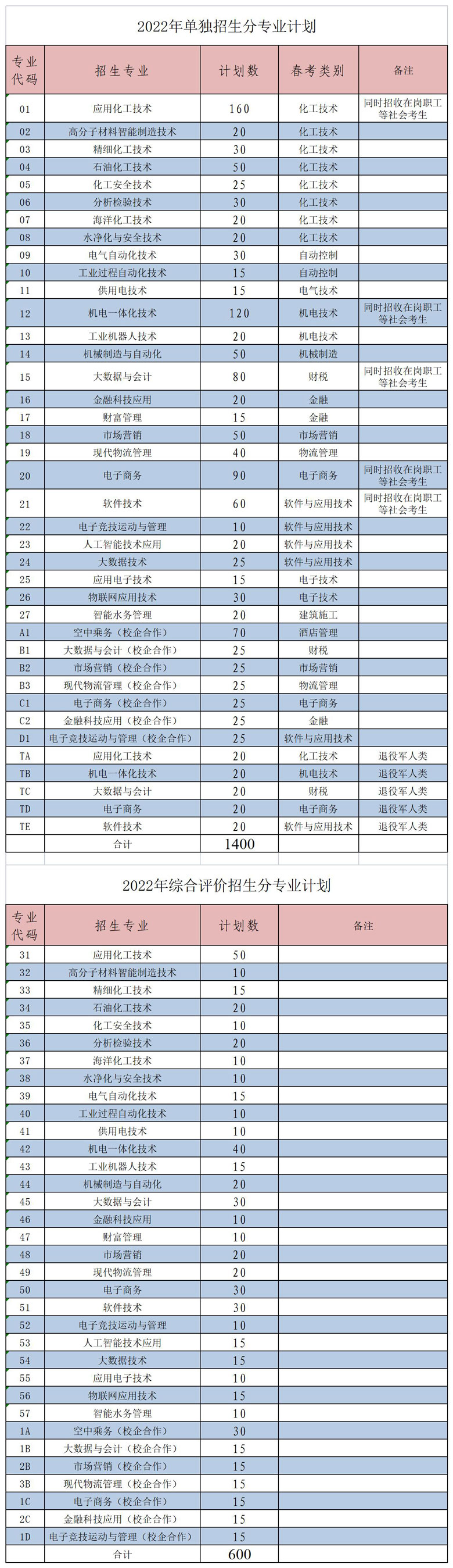 山東化工職業學院2022年安排單獨招生計劃 1400 人(含退役軍人 100 人),綜合評價招生計劃 600 人。單獨招生和綜合評價招生計劃為指導性計劃,會根據相關政策和報名錄取情況在總計劃內適當調整。