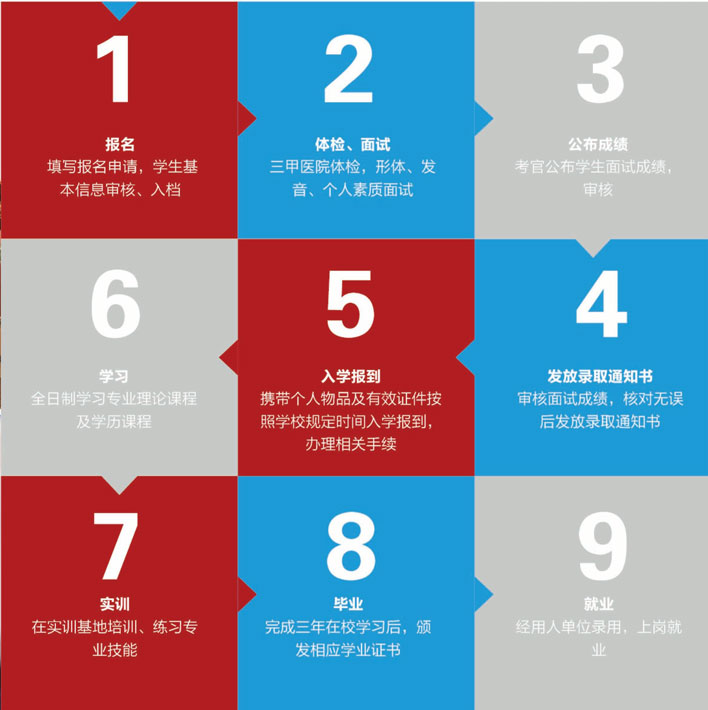 面向全國(guó)招收應(yīng)往屆高中畢業(yè)生或同等學(xué)歷者(含職高、中專(zhuān)、技校、藝校),形象、氣質(zhì)好,需面試、體檢合格。