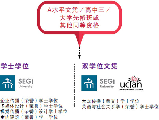 世紀大學與英國中央蘭開夏大學 | 高中三考獲 5 科優等,學分總平均 CGPA 2.0或以上并且于大馬教育文憑考試 (SPM) 中至少考獲 3 科優等,包括英語/預科文憑/ A 水平文憑或同等資格。相關大專文憑 / 獨中統考文憑(UEC) 考獲 5 科 B 等 | 3年 | 哥打白沙羅 |