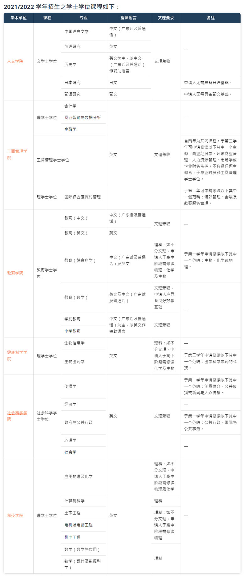 各個學院的學科特色鮮明,提供學士、碩士、博士等130多個學位課程,涵蓋不同領域的專業學科。學士學位課程采學分及書院制,以英語為主要授課語言。