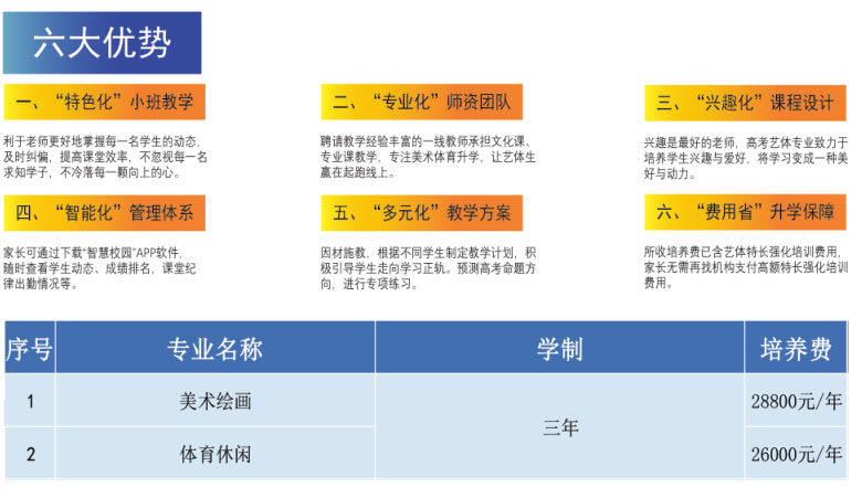福州市華幟技工學校開設藝術體育升學班,專注于體育、美術升學教育,為有志于大學本科的初中畢業生開辟一條“捷徑賽道"。美術,體育升學是我國高考升學的一種考試方式,包括文化課考試和專業課考試,只要文化課考試和專業課考試均通過藝體類錄取本科線,就能被大學高校錄取。以專業課為升學優勢,通過三年學習,突出重圍,鳳凰涅槃,以達“圓大學本科夢”為辦學目標。