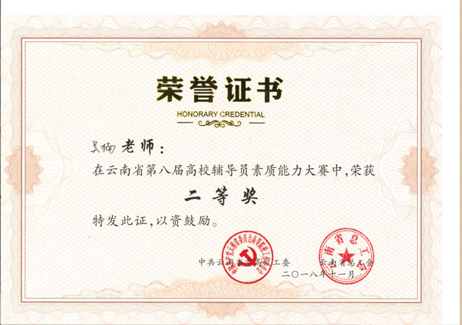 11月29至30日,由省委高校工委、省總工會主辦,云南財經大學承辦的云南省第八屆高校輔導員素質能力大賽決賽在云南財經大學舉行,來自全省64所高校的78名高校輔導員聚集一堂,交流思想,暢談心得,進行了輔導員工作技能的大比拼。我校濕地學院輔導員吳楠代表學校參加比賽,并獲得大賽二等獎。我校獲得優秀組織獎。