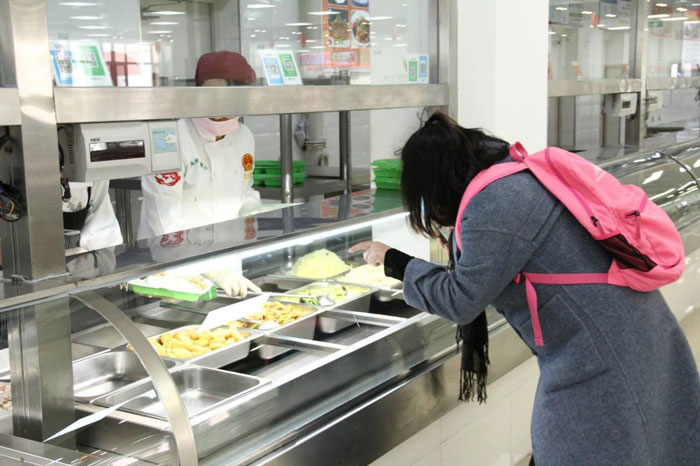 在學生用餐環節演練中,學校實行錯時錯峰間隔就餐制度,由專門人員指引間隔一米以上有序排隊進入食堂,經消毒、洗手等流程和體溫檢測合格后,方可進入食堂就餐。同時,為防止就餐期間飛沫傳播,就餐者之間需保持一米以上距離,隔座用餐,同向相坐。并對食堂進行定時消殺,保證師生就餐安全。