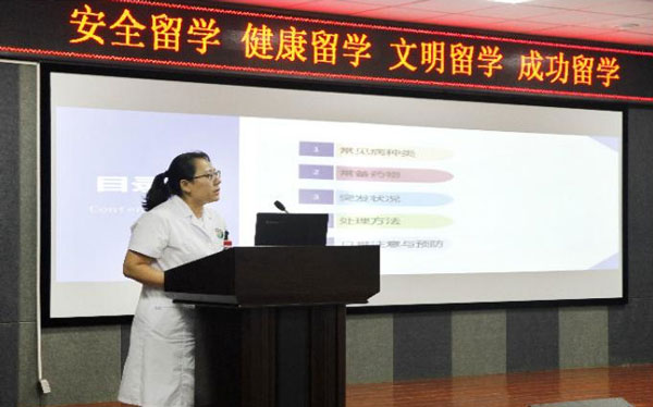 西安外國語大學校醫院心血管外科主治醫師陳麗娜(原第四軍醫大學西京醫院心血管外科ICU主治醫師)從“常見病種類”、“常備藥物”、“突發狀況及處理方法”、“日常注意與預防事項”等方面,為參訓學生傳授“出國留學急救小常識”。陳醫生指出,安全留學,個人安全是重中之重,出國留學人員一定要掌握一些急救、自救常識應對日常生活中可能出現的意外或者傷害,學會保護自己。