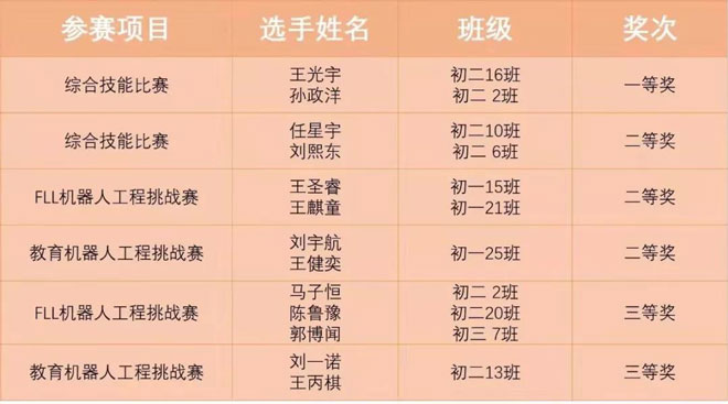 濰坊文華學校共選拔六支隊伍參加比賽,在綜合技能、教育機器人工程挑戰賽、FLL工程挑戰賽三項比賽中,取得了一項一等獎、三項二等獎、兩項三等獎的優異成績。