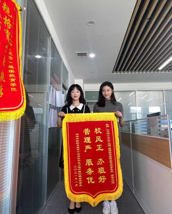 培訓結束后,濟南市黨校系統骨干師資教研能力提升培訓班全體學員向哈爾濱工業大學(威海)繼續教育學院及班主任李佳宜、譚雅文老師送贈送了一面寫有“校風正、辦班好、管理嚴、服務優”的錦旗,并對哈爾濱工業大學(威海)繼續教育學院工作人員在培訓期間高效、專業、貼心的服務表示真誠地感謝。